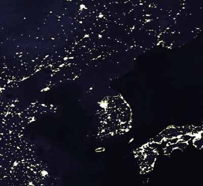 The bright spot near the middle is Seoul. Black area above that is North Korea. The little cluster of light in the middle of the dark area is Pyung-yang, capital of North Korea. I guess there aren't many nightclubs in North Korea. If China can look that good in a couple of decades, North Korea can too. I hope I can boogie in North Korea before I croak.