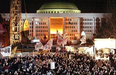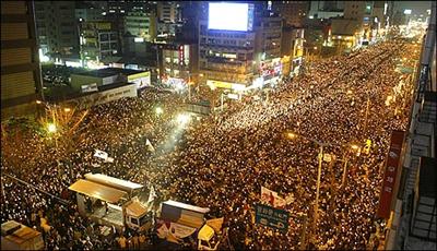 People are gathering for massive candle vigils in Seoul (English version) .  Below is picture from Jong-ro district at the heart of Old Seoul on the evening of March 13th.  Such events became popular recently to give visible mass to the voice of the people.  Pretty effective, I think because eventually the choice comes down to surrendering or doing stupid things that could turn the crowd violent.