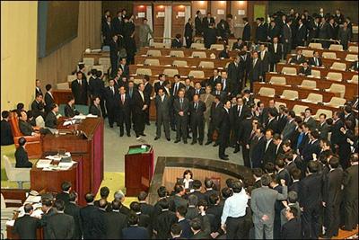 While I was having dinner, Korean Assembly controlled by the corrupted opposition parties impeached President Roh.  This CNN article depicts the cause of his impeachment as if he has done something wrong.  He hasn't.  Corruption scandal mentioned in the article pales in comparison to the corruption scandals of the opposition parties.